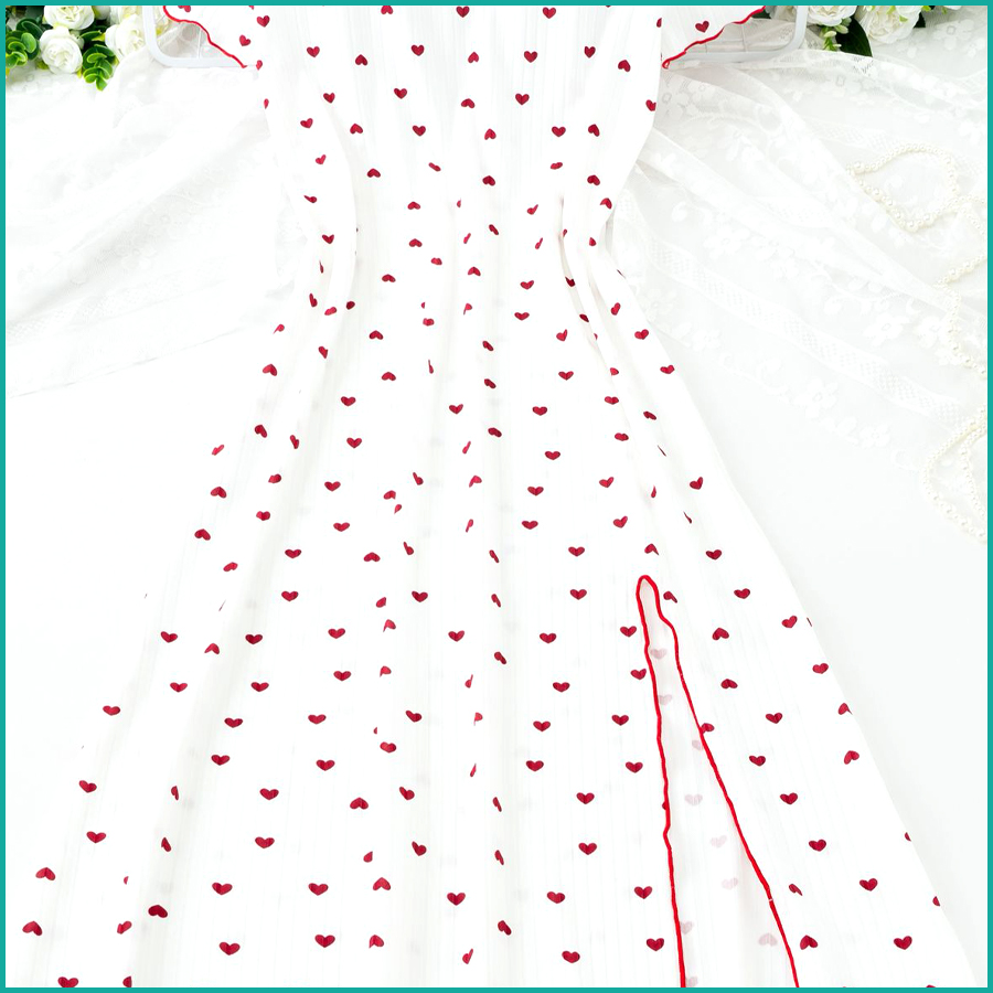 Cute Heart-Print Nightdress with a Side Slit and Red Bow Detail – White