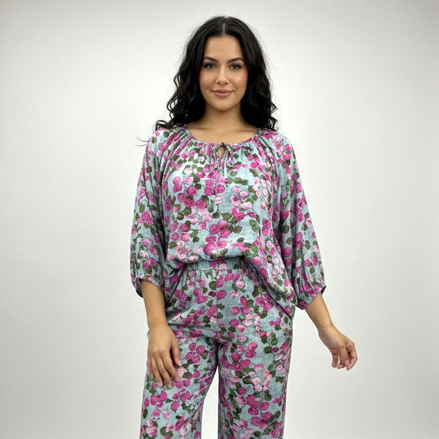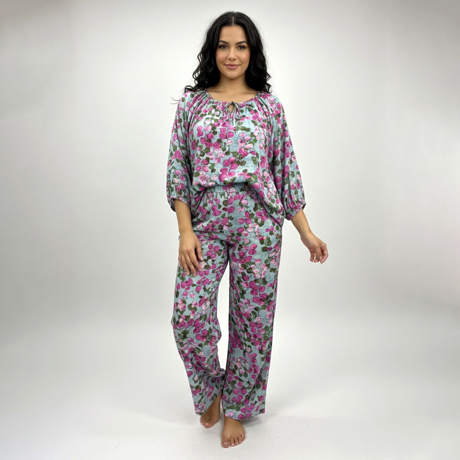Floral Leaves Ladies Linen Pajama Loungewear – Sky Blue
