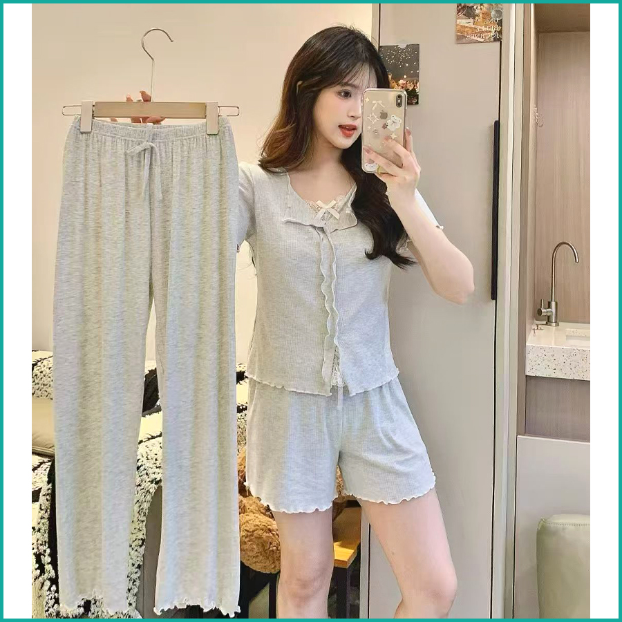 Bow Ladies 3 Pcs Set Loungewear Pajama Set - Light Grey