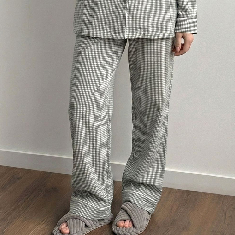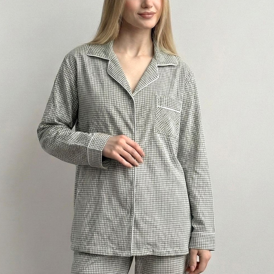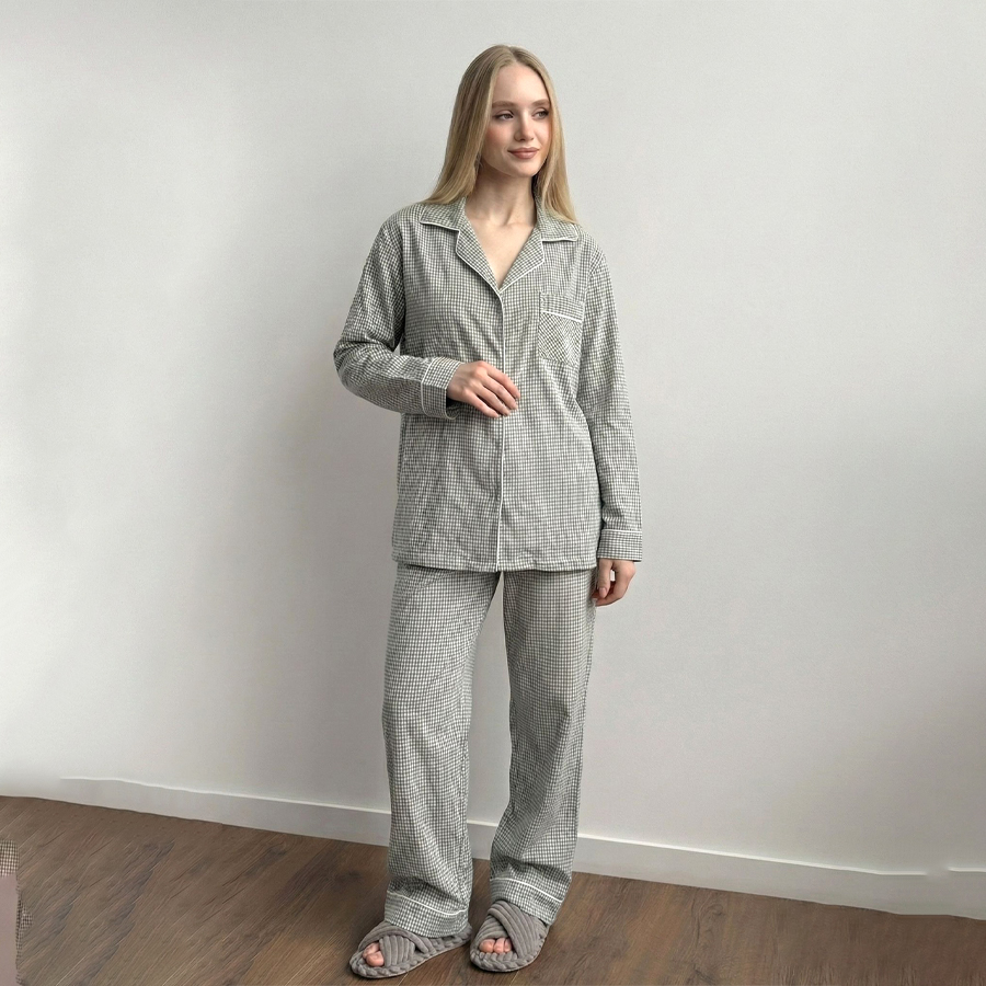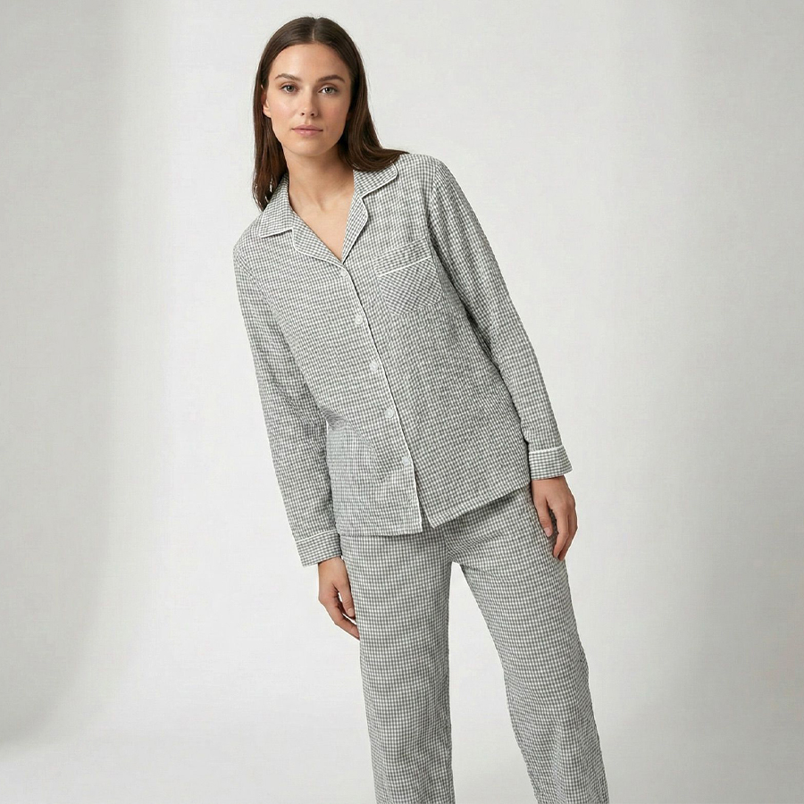 Mini Checks Ladies Front Open Pajama Set – Grey