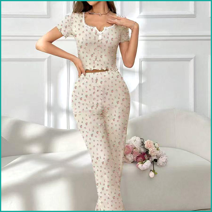 Mini Floral Ladies Loungewear Pajama Set -Cream
