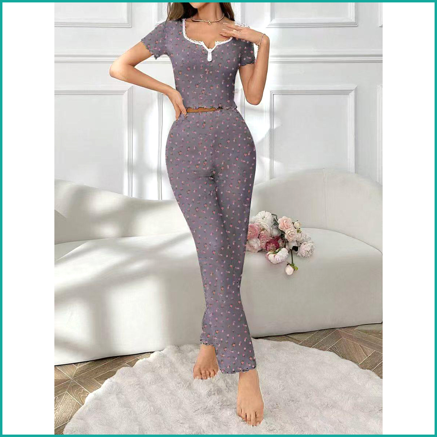 Mini Floral Ladies Loungewear Pajama Set – Grey