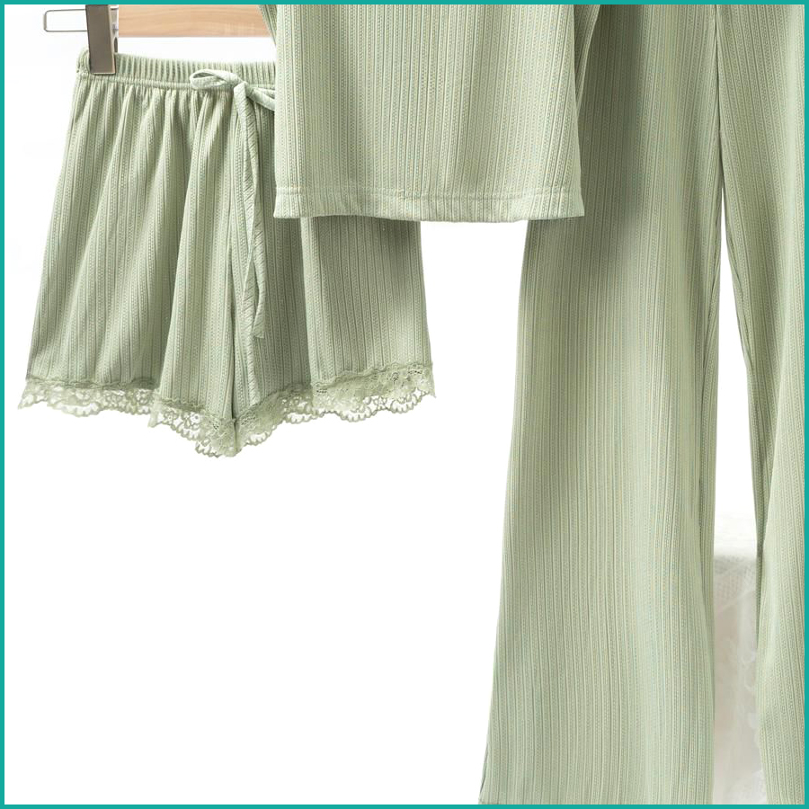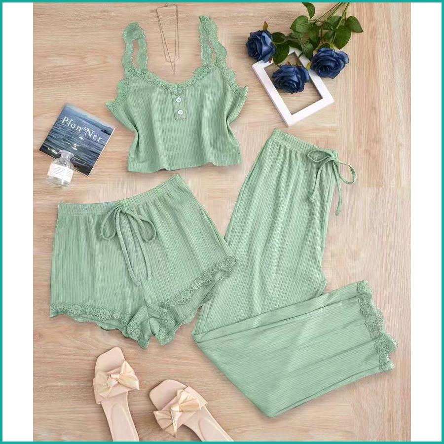 Plain Lace Ladies Crop T-Shirt loungewear 3 Pcs Set – Green