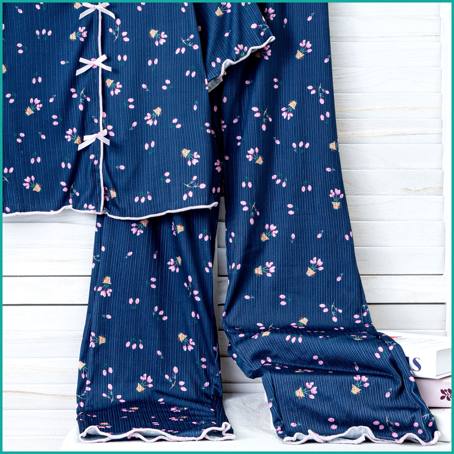 Tulips Ladies Crop T-Shirt Loungewear Pajama Set – Blue
